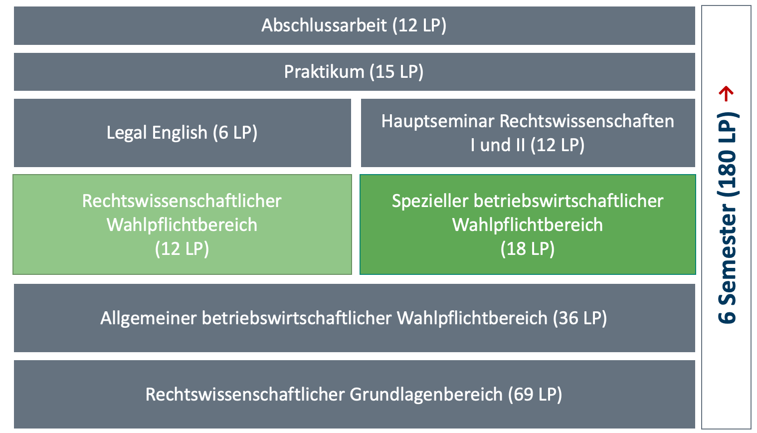 Der sechssemestrige Bachelor-Studiengang schafft ein breites Grundlagenwissen in den wirtschaftsnahen Bereichen des Rechts und in den Wirtschaftswissenschaften. Die große Anzahl an Schwerpunktmodulen im juristischen als auch wirtschaftswissenschaftlichen Bereich ermöglichen den Studierenden neben den Grundlagen einen individuellen Studienschwerpunkt zu setzen. Darüber hinaus wird der Schwerpunkt auf die Aneignung von Softskills für einen erfolgreichen Einstieg ins Berufsleben gelegt.